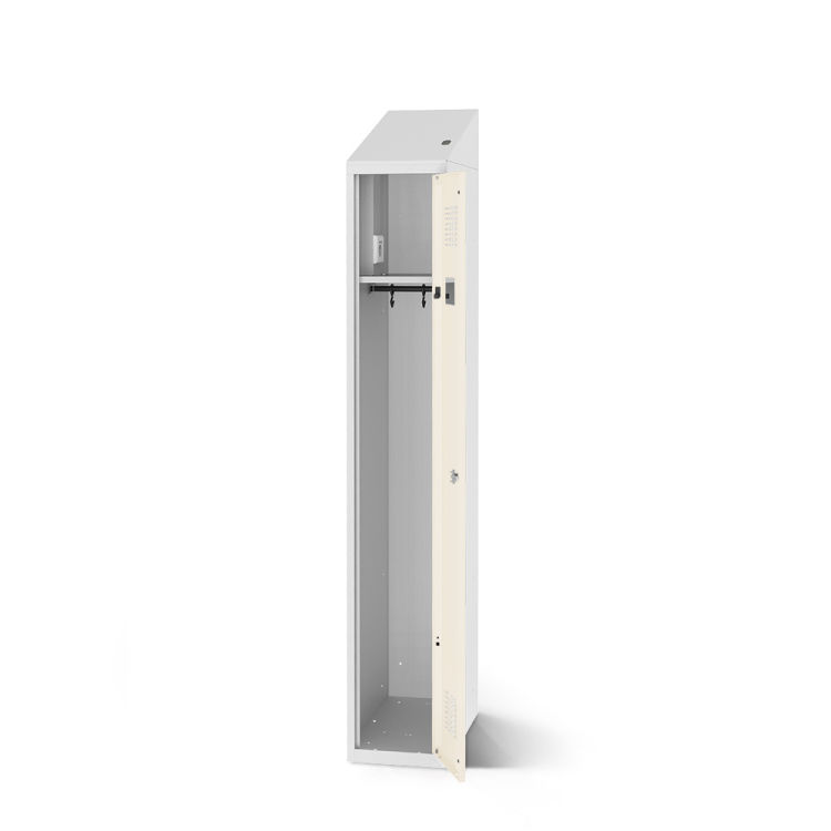 Die Qualität dieses Spinds zeigt sich in jedem Detail, von den verstärkten Türen bis zu den Gummipuffern und kräftigen Drehbolzen. Sie haben auch die Möglichkeit, den Spind nach Ihren Wünschen anzupassen, dank der verschiedenen Farb- und Ausstattungsvarianten.