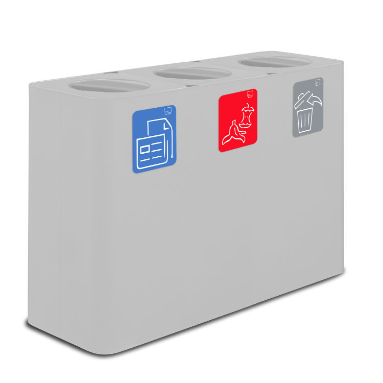 Elegantes und funktionelles Abfallsammelsystem, komplett aus Stahl gefertigt. Deckel mit Kippfunktion. Sackeinwurf über Technopolymerring mit Sackverriegelung und verzinkter Verriegelungsstange. Entleerung der Säcke von oben. Inklusive 5 magnetischen Piktogrammen für die Abfalltrennung. Bodenschonende Technopolymer-Füße