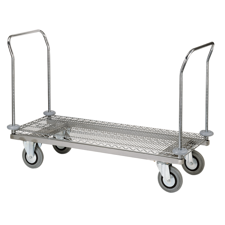 Der Wagen ist mit zwei praktischen Schiebegriffen ausgestattet, die trotz der hohen Lasten eine gute Kontrolle ermöglichen. Ein Highlight sind die speziellen, extra robusten 160 mm Rollen: Zwei davon sind fixiert, während zwei weitere um 360° schwenkbar sind, was eine optimale Kombination aus Spurtreue und Manövrierbarkeit bietet. Vier Gummipuffer schützen den Wagen und Ihre Umgebung effektiv vor Stößen.
